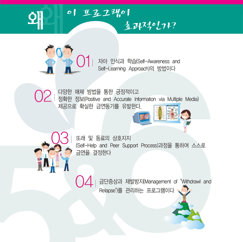 | ÀÌ ÇÁ·Î±×·¥ÀÇ Æ¯Â¡Àº Å©°Ô ³× °¡Áö ¹æ¹ýÀ¸·Î Àû¿ëµÈ´Ù. ÀÚ¾Æ Àνİú ÇнÀ(Self-Awareness and Self-Learning Approach)ÀÇ ¹æ¹ý, ´Ù¾çÇÑ ¸Åü¸¦ ÅëÇÑ ±àÁ¤ÀûÀ̰í Á¤È®ÇÑ Á¤º¸Á¦°ø(Positive and Accurate Information via Multiple Media), ¶Ç·¡ ¹× µ¿·áÀÇ »óÈ£ÁöÁö(Self-Help and Peer Support Process), ±Ý´ÜÁõ»ó°ú Àç¹ß ¹æÁö( Management of "Withdrawl and Relapse")¸¦ °ü¸®ÇØÁÖ´Â ÇÁ·Î±×·¥ÀÌ´Ù. |